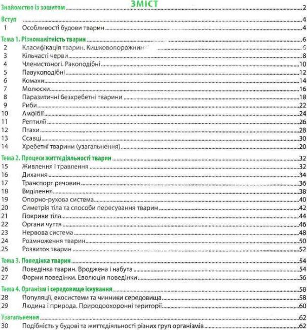 Зошит укладено відповідно до чинної програми з біології для 7 класу загальноосвітніх навчальних закладів до будь-якого чинного підручника Біологія 7 клас за новою програмою. Він складається з двох частин робочого зошита і зошита для практичних робіт. Містить різноманітні завдання для роботи на уроці і вдома. У кінці кожної теми розміщено завдання для узагальнення знань, подані у двох варіантах. Має електронний додаток.