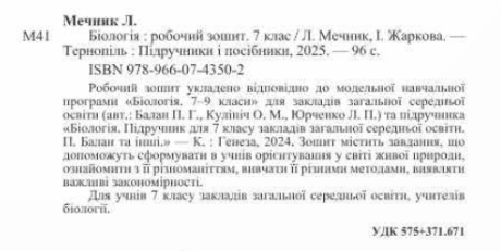 Робочий зошит укладено відповідно до модельної навчальної програми «Біологія. 7-9 класи» для закладів загальної середньої освіти (авт.: Балан П. Г., Кулініч О. М., Юрченко Л. П.) та підручника «Біологія. Підручник для 7 класу закладів загальної середньої освіти. П. Балан та інші.» – К. : Генеза, 2024. Зошит містить завдання, що допоможуть сформувати в учнів орієнтування у світі живої природи, ознайомити з її різноманіттям, вивчати її різними методами, виявляти важливі закономірності.