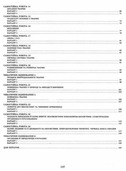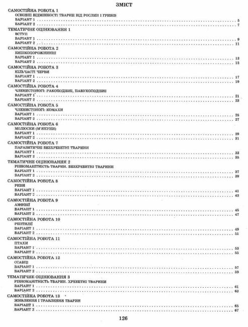 Зошит для поточного та тематичного оцінювання з біології для 7 класу за новою програмою до будь-якого чинного підручника Біологія 7 клас Нова програма містить завдання у тестовій формі для контролю знань учнів. Позитивним у зошиті є наявність усіх самостійних робіт і тематичного оцінювання, передбачених чинною програмою, затвердженою МОН України. Навчальне видання допоможе вчителеві здійснювати постійний контроль над засвоєнням учнями навчального матеріалу, а учневі — зорієнтуватися у завданнях тестової форми та набути навичок швидкого та безпомилкового заповнення бланка відповідей. Окрім того школярі можуть використовувати зошит під час самостійної підготовки до роботи із тестовими завданнями, самоперевірки знань, умінь та навичок.