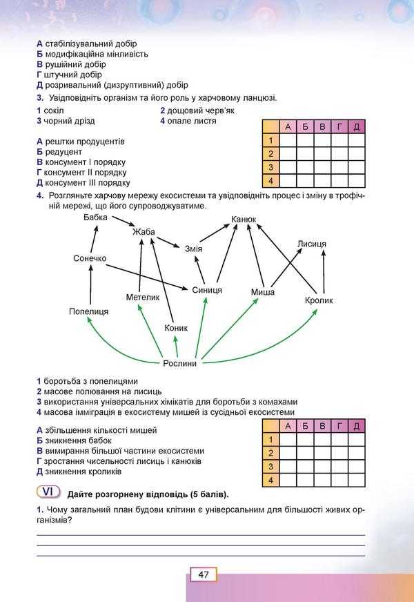 У другій частині наведено по два варіанти п’яти різнорівневих підсумкових робіт за узагальнювальними темами: "Хімічний склад клітини та біологічні молекули", "Структура та функціонування клітини", "Спадкова інформація", "Еволюція. Екологія", "Прикладна біологія".
