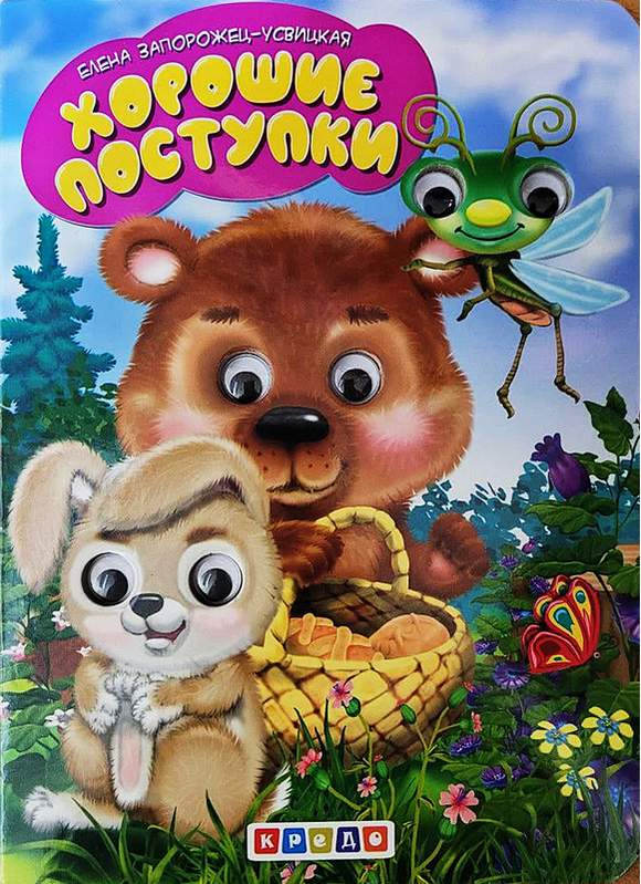 Глазки (двойные) Хорошие поступки Кредо. Книжка-картонка для самых маленьких читателей. На каждой странице у героя на месте глаз - прорези, на последней странице - пластиковые глазки с подвижными зрачками.
