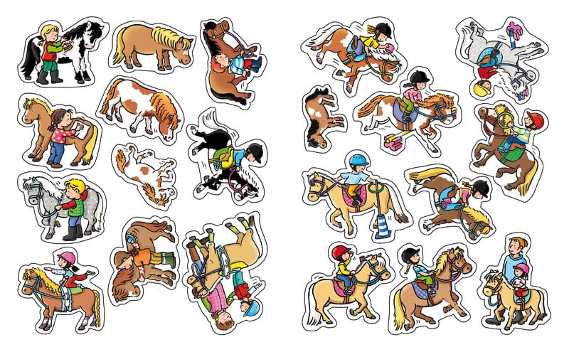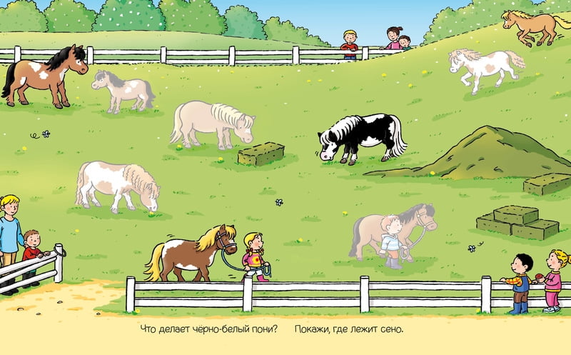 Ты узнаешь, как за ними ухаживать, чем кормить и как можно на них ездить. Давай откроем книжку, найдём и приклеим всех лошадок.