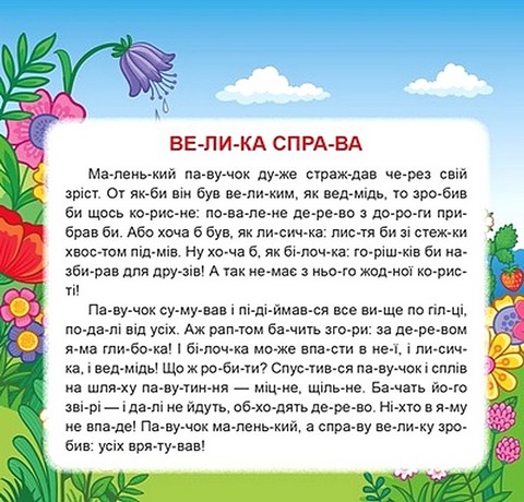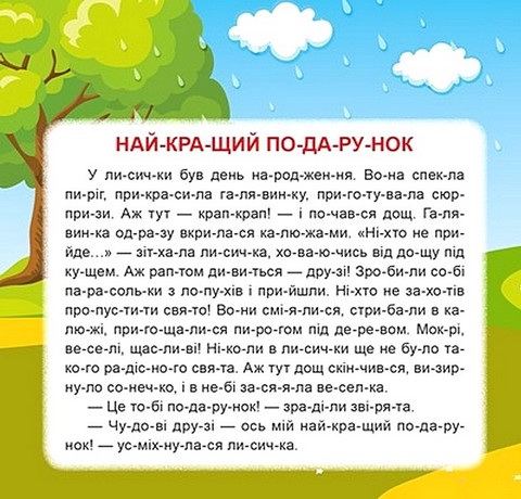 Книга призначена для формування й вдосконалення навичок читання по складах як важливого компонента мовленнєвого розвитку дітей. Невеликі за обсягом тексти, герої яких потрапляють у цікаві пригоди, спонукатимуть до розвитку пізнавального та читацького інтересу малюків. А виховний зміст історій сприятиме виявленню моральних якостей маленьких читачів.