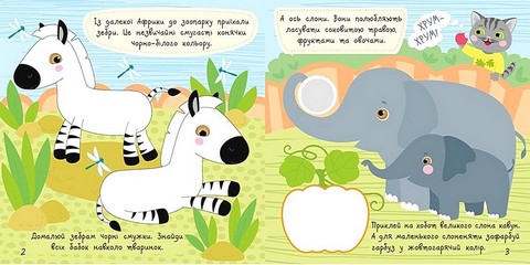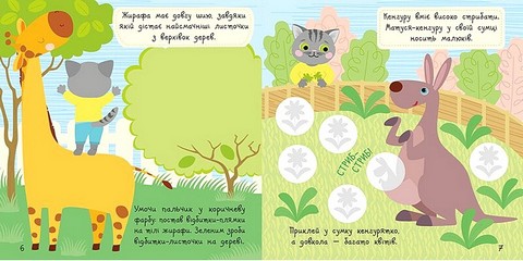 Зоопарк Малюк Киць-Киць запрошує на відвідини зоопарку. Гортаючи книгу, дитина знайомитиметься з різними тваринами, виконуватиме чимало цікавих завдань, клеїтиме яскраві наліпки. Ось зебри, яким треба домалювати смужки. Ось крижаний будиночок, куди дитина поселить пінгвінів. А ось крокодил, якому треба домалювати зуби та приклеїти поруч яйця з його дитинчатами. На дитину та малюка Киць-Киця чекає чимало цікавих пригод!