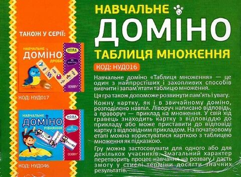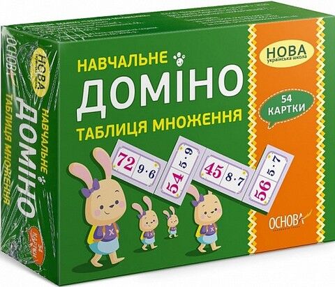 Навчальне доміно «Таблиця множення» - це один з найпростіших і захоплюючих способів вивчити і запам'ятати таблицю множення. Ця гра також допоможе розвинути пам'ять і увагу. За Концепцією Нової української школи вагому роль у вихованні та навчанні молодших школярів відіграє дидактика та методика «Навчання через гру». За допомогою цікавої навчальної гри, вчитель сприятиме формуванню базових математичних уявлень та допоможе учням запам’ятати таблицю множення. На уроках у школі «Навчальне доміно» можна використовувати не лише на етапі ознайомлення з таблицею множення, але і під час відпрацювання й закріплення здобутих знань. Гру можна застосовувати для одного або для декількох учасників. Кожну картку, як і в звичайному доміно, розподілено навпіл. Ліворуч написана відповідь, а праворуч - приклад на множення.