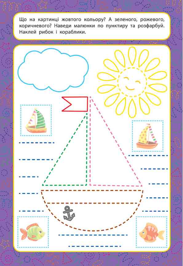Прописи для малят Кольори 3+ Смирнова К. УЛА. Це видання допоможе дитині запам’ятати назви кольорів. Виконуючи завдання, малюк потренується визначати колір предмета, наведе пунтирні лінії, розфарбує малюнки та попрацює з наліпками.