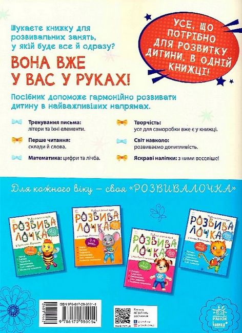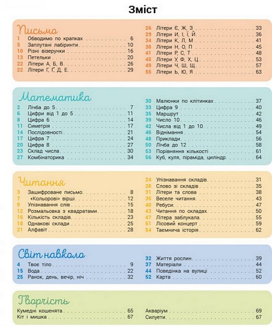Цей унікальний посібник охоплює найважливіші знання та вміння, які має опанувати дитина віком 5–6 років - письмо, читання, математика, світ довкола. На сторінках вам зустрінуться як традиційні завдання, так і альтернативні, спрямовані на розвиток творчих здібностей дитини.