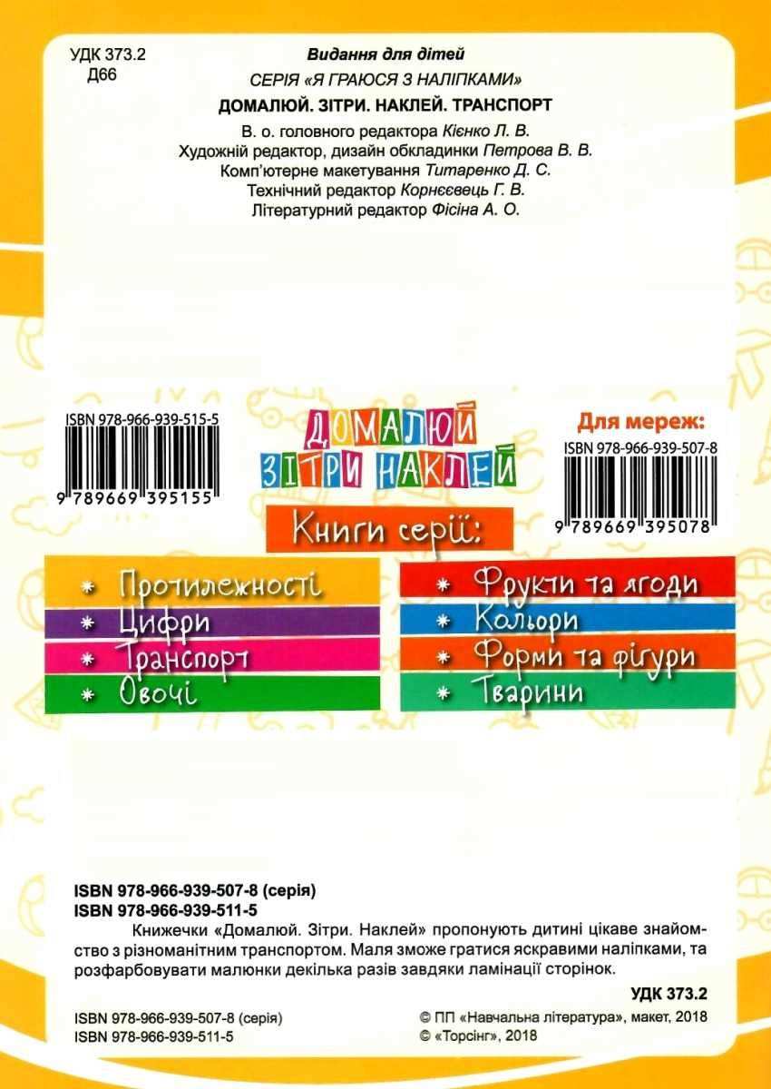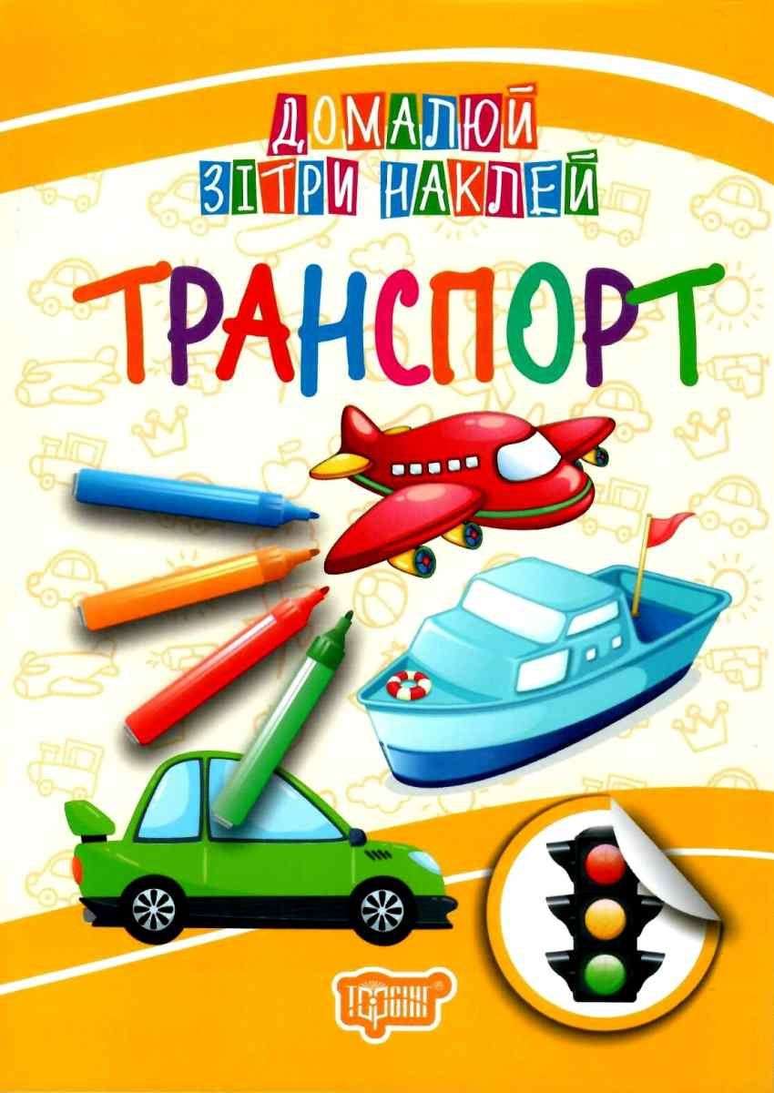 Транспорт Домалюй, зітри, наклей Торсінг. Книжечки пропонують дитині цікаве знайомство з різноманітним транспортом. Маля зможе гратися яскравими наліпками, та розфарбовувати малюнки декілька разів завдяки ламінації сторінок