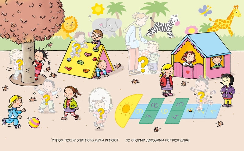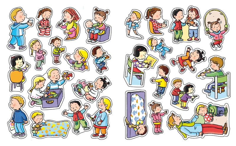 Открой книжку и узнай, что делают дети в детском саду! Побывай на детской площадке и на ферме, найди в наклейках и приклей всех детишек.