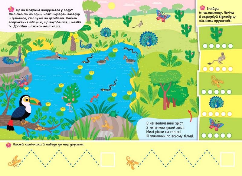 Яскрава книжка-гра «Знайди мене. У зоопарку» допоможе дитині пригадати тварин світу, упізнати їх за особливими зовнішніми прикметами й наклеїти зображення кожного повністю. На кожній сторінці є додаткові цікаві завдання, у яких потрібно знайти й полічити різні елементи, відгадати тематичні загадки й навести пунктирні лінії-доріжки. Дрібні наліпки допоможуть розвинути фантазію і креативність.