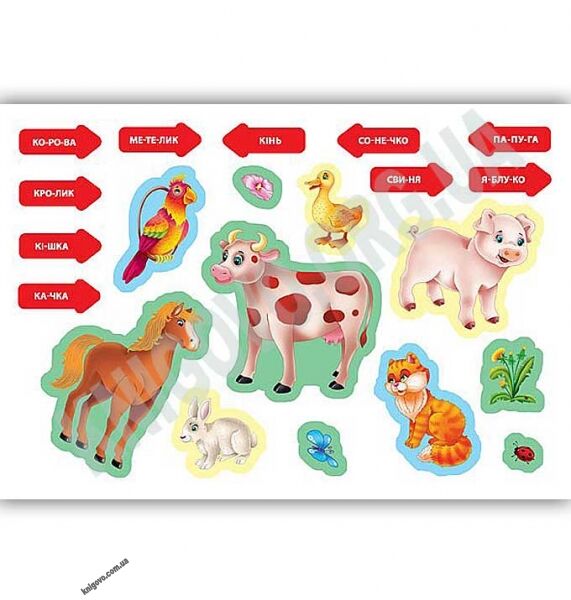Гра Домашні тварини призначена для малюків віком від 3-х років. До набору входять три кольорові фони та два аркуші з наліпками зображення тварин та стрілочки з їхніми назвами. Заповнюючи фони наліпками, дитина: