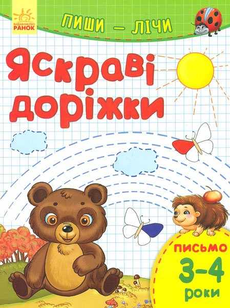 Яскраві доріжки Пиши лічи Письмо 3-4 роки містить: цікаві завдання, вправи підібрані за віком, сучасні картинки, гендерну універсальність, навчання у формі гри.