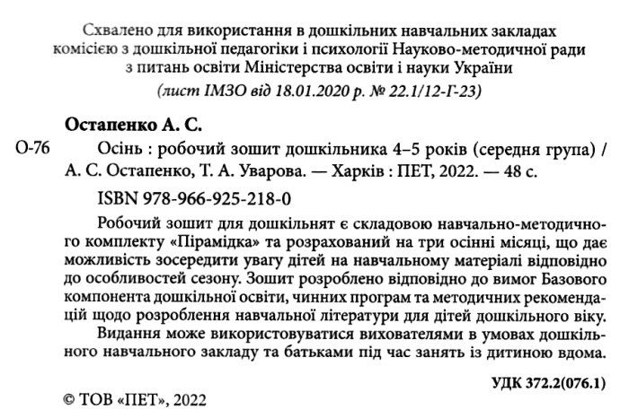 Робочий зошит дошкільника Осінь Середня група 4-5 років Авт: Остапенко А. Вид-во: ПЕТ 13621