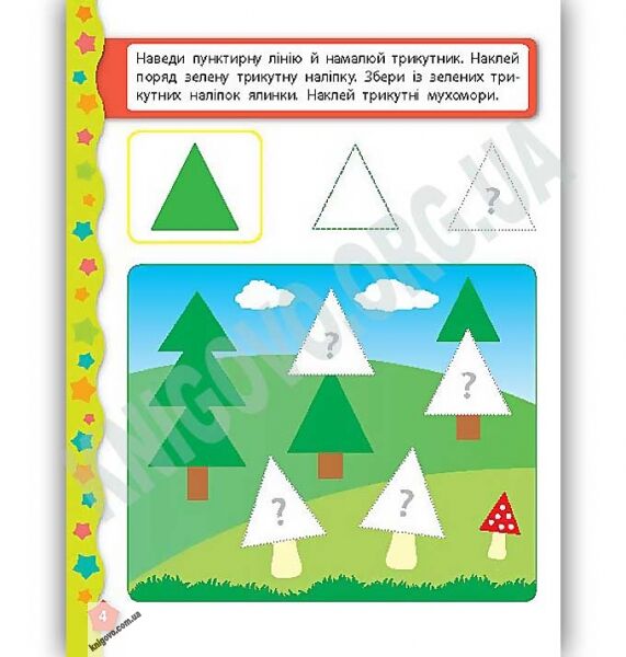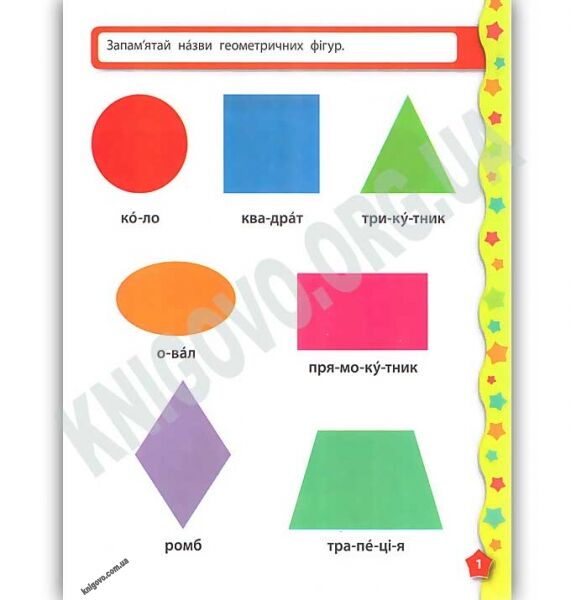 Ця книга познайомить вашу дитину з основними геометричними фігурами, такими як квадрат, трикутник, коло, прямокутник, ромб, овал та трапеція. Виконуючи захопливі