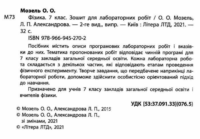 Зошит для лабораторних робіт Фізика 7 клас Оновлена програма 2-ге видання Авт: Мозель О.О. Александрова Л.П. Вид-во: Літера 66548