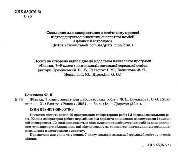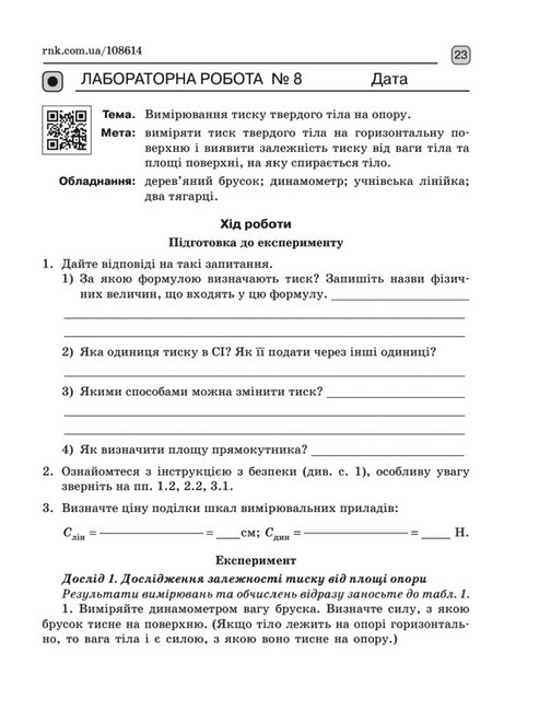 Зошит для лабораторних робіт Фізика 7 клас НУШ Авт: Ф. Божинова О. Кірюхіна Вид-во: Ранок 101281