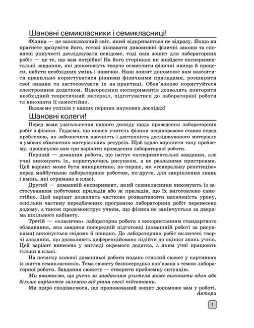 Зошит для лабораторних робіт відповідає чинній програмі з фізики для 7 класу загальноосвітніх навчальних закладів і містить описи 12 лабораторних робіт. Кожна робота передбачає два варіанти виконання: за рисунками і домашній експеримент. До видання додається опис класичних лабораторних робіт із використанням стандартного обладнання, які візуалізовано за допомогою відеороликів. Призначено для учнів 7 класу закладів загальної середньої освіти, учителів фізики.
