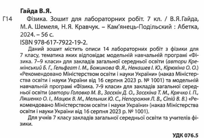Лабораторні роботи Фізика 7 клас НУШ Авт: Гайда В.Я. Шемеля М.А. Кравчук Н.Я. Вид-во: Абетка 101369