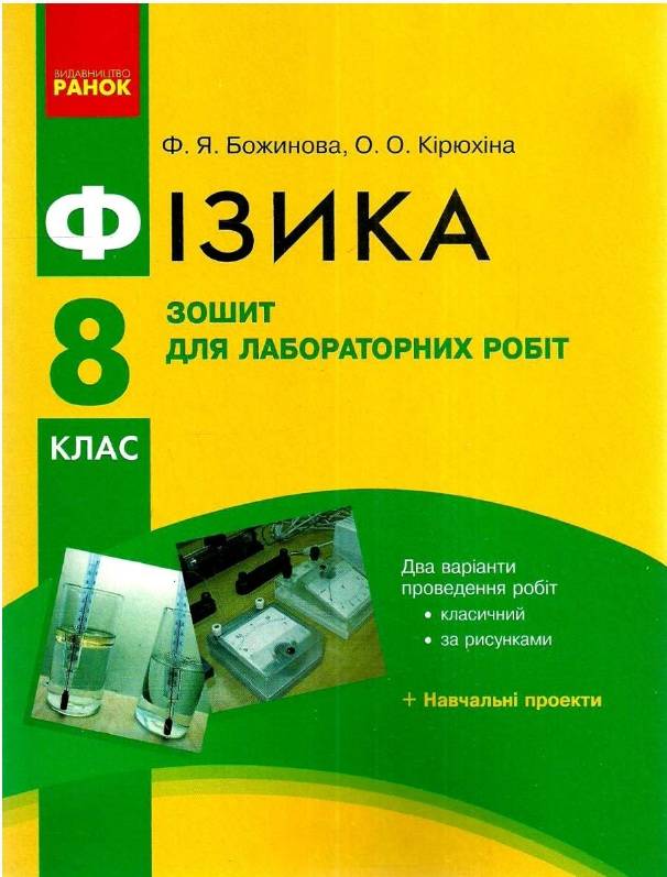 Зошит для лабораторних робіт з Фізики для учнів 8 класу складений за Новою програмою та містить описи 5 лабораторних робіт і 2 навчальних проектів. До видання додається опис класичних лабораторних робіт із використанням стандартного обладнання. Призначено для учнів 8 класу загальноосвітніх навчальних закладів, учителів фізики. До будь-якого чинного підручника Фізика 8 клас Нова програма.