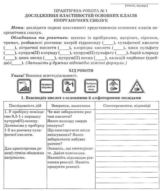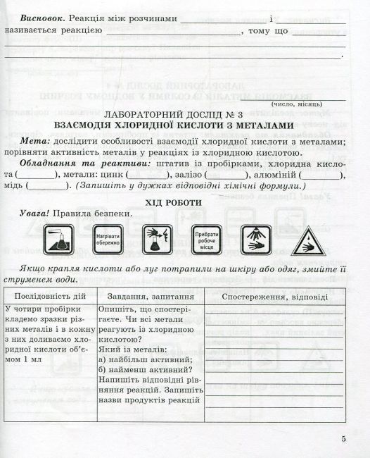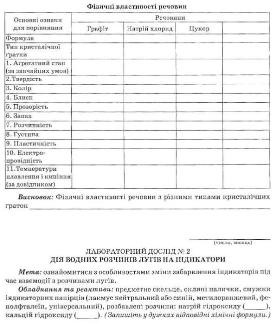 За змістом і структурою зошит відповідає чинній програмі з хімії для 8 класу, враховуючи зміни, внесені у 2017 році. Він передбачає виконання 3 практичних робіт та 7 лабораторних дослідів, що дозволяє учням послідовно закріплювати знання та розвивати практичні навички.