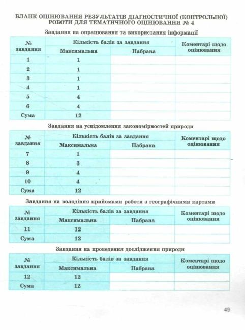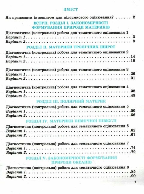 Навчальні практикоорієнтовані, дослідницькі і творчі завдання різного рівня складності до кожної з тем побудовані на основі компетентнісного і діяльнісного підходів. Навчальний посібник містить 7 діагностичних (контрольних) робіт для тематичного оцінювання (у 2-х варіантах кожна). Вони відповідають вимогам державного стандарту, спрямовані на реалізацію обов’язкових результатів навчання, формування предметних і ключових компетентностей.