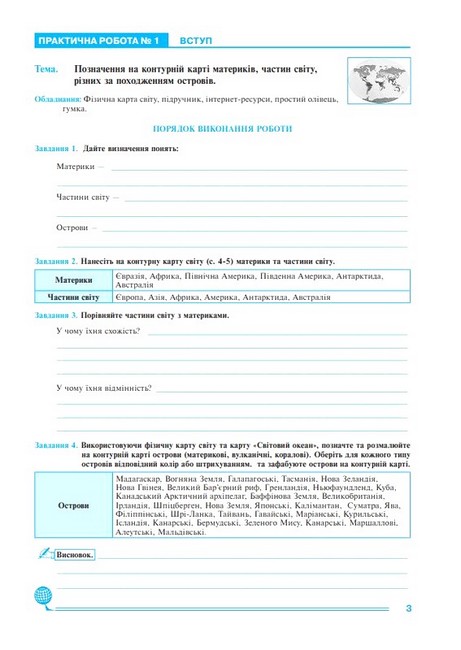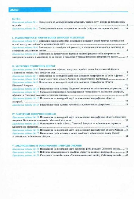 У посібнику подано підбірку практичних робіт, спрямованих на забезпечення очікуваних результатів навчально-пізнавальної діяльності учнів. Пропоновані завдання забезпечують реалізацію компетентнісного підходу в сучасній географічній освіті. Усі роботи складено відповідно до модельної навчальної програми «Географія. 6-9 кл.» (авт. Кобернік С. Г. та ін.) Для вчителів географії та учнів 7 класу.
