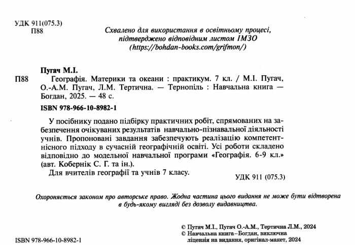 Практикум Географія Материки та океани 7 клас НУШ Авт: Пугач М.І. та ін. Вид-во: Богдан 103819