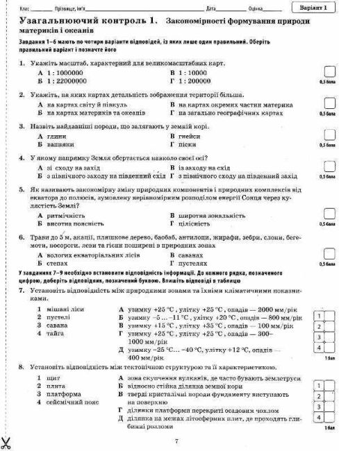 Зошит для поточного та тематичного оцінювання Географія Материки і Океани 7 клас Нова програма. Робочий зошит укладено відповідно до нової навчальної програми з географії, затвердженої Міністерством освіти і науки України.