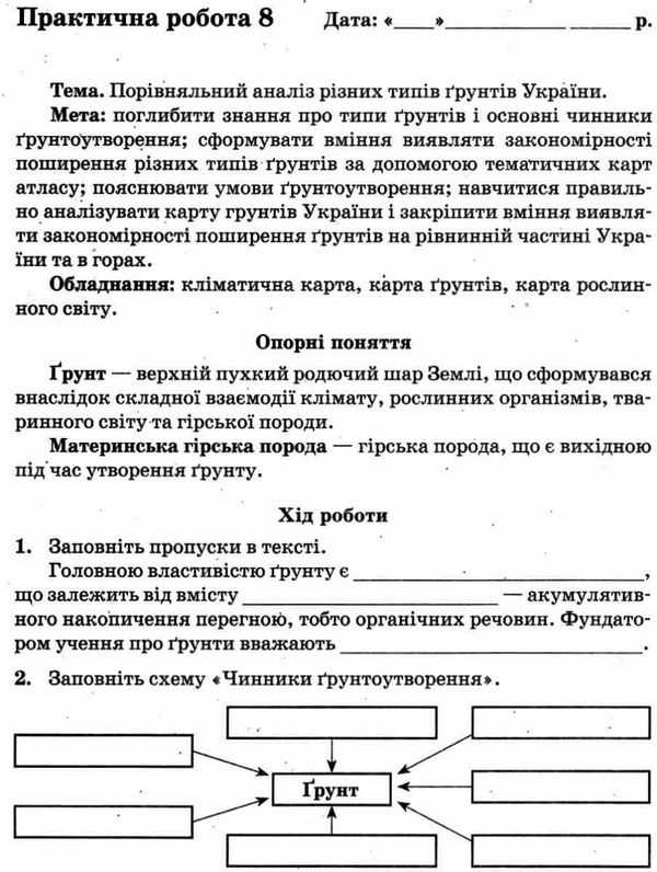 Зошит укладено відповідно до чинної навчальної програми з географії, затвердженої Міністерством освіти і науки України наказ від 07.06.2017 № 804. Мета створення цого зошита це допомогти вчителеві провести всі практичні роботи протягом року, що сприятиме кращому закріпленню теоретичних відомостей з курсу географії 8 класу. Зошит розрахован на учнів загальноосвітніх навчальних закладів і вчителів географії.