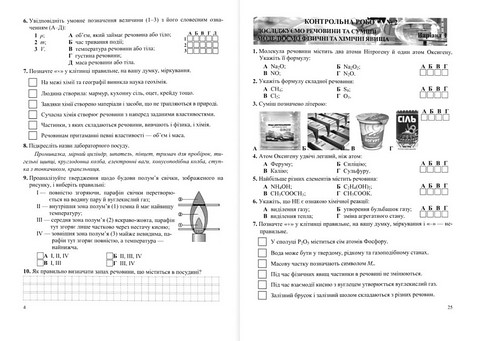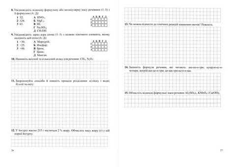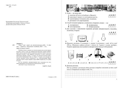 Посібник містить завдання для діагностування результатів навчання учнів з хімії в 7 класі, що здійснюється письмово у формі комбінованої діагностувальної роботи наприкінці вивчення кожного розділу. Завдання складено у двох варіантах відповідно до змісту модельних навчальних програм: «Хімія. 7-9 класи» для закладів загальної середньої освіти (Григорович О. В.) та «Хімія. 7-9 класи» для закладів загальної середньої освіти (Лашевська Г. А.). «Рекомендовано Міністерством освіти і науки України» (наказ МОН України від 27.12.2023 N? 1575).