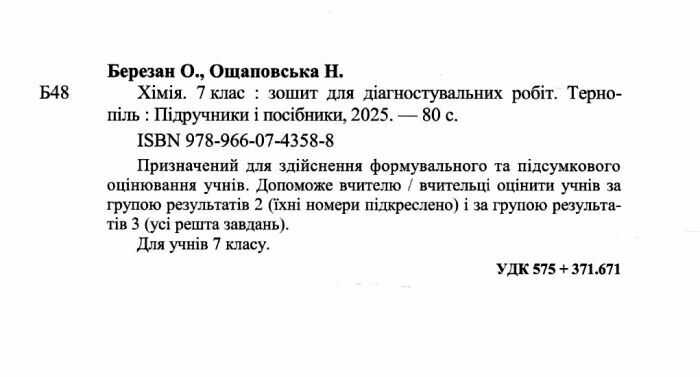 Діагностувальні роботи Хімія 7 клас НУШ До підручника О. Григорович Авт: О. Березан Н. Ощаповська Вид-во: Підручники і посібни 106380