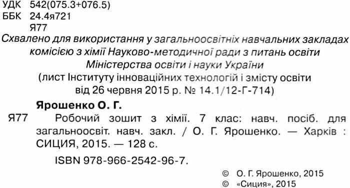Робочий зошит з хімії 7 клас Нова програма Авт: Ярошенко О.Г. Вид-во: Сиция 13662