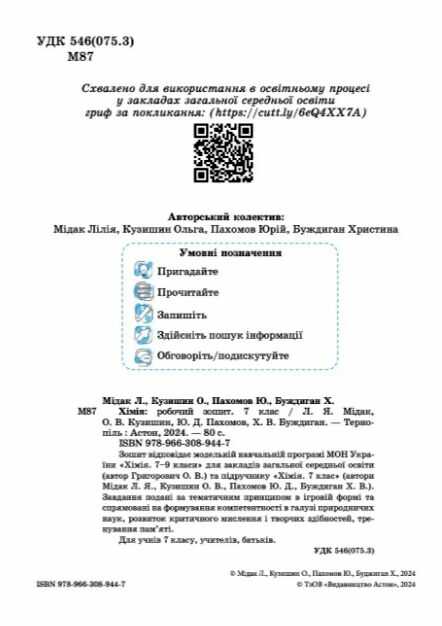 Робочий зошит Хімія 7 клас НУШ Авт: Л.Я. Мідак О.В. Кузишин Ю.Д. Пахомов Х.В. Буждиган Вид-во: Астон 104753