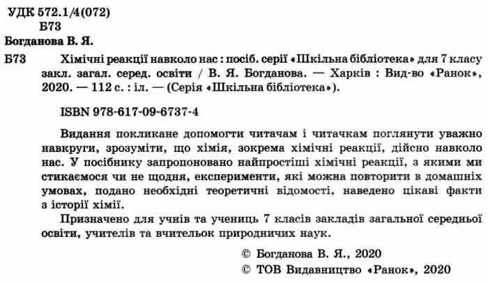 Шкільна бібліотека Хімічні реакції навколо нас Посібник для 7 класу Богданова В. Ранок. Видання покликане допомогти читачам і читачкам поглянути уважно навкруги, зрозуміти, що хімія, зокрема хімічні реакції, дійсно навколо нас.