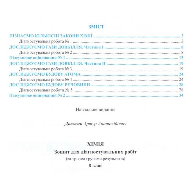 Посібник «Діагностувальні роботи. Хімія, 8 клас НУШ» авторства Артура Довжика, виданий у видавництві Підручники і посібники, призначений для оцінювання результатів навчання учнів з хімії у 8 класі. Він допомагає системно перевіряти знання та вміння учнів на різних етапах вивчення теми.