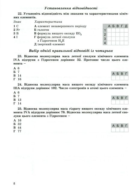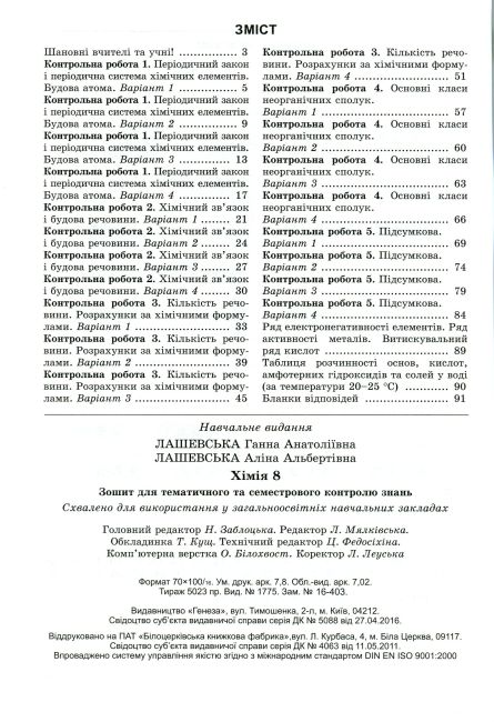 Зошит для тематичного та семестрового контролю знань з хімії для учнів 8 класу укладено за Новою програмою та відповідає підручнику «Хімія 8 клас» авторів Г. Лашевської та А. Лашевської (видавництво Генеза). Видання створене для якісної перевірки навчальних досягнень учнів протягом усього навчального року.