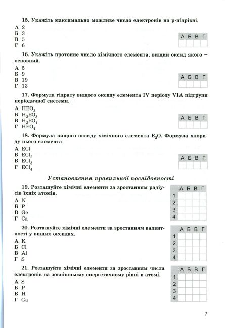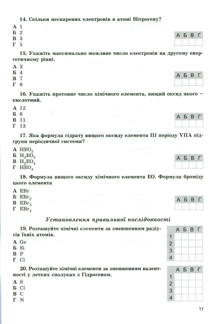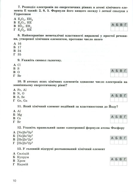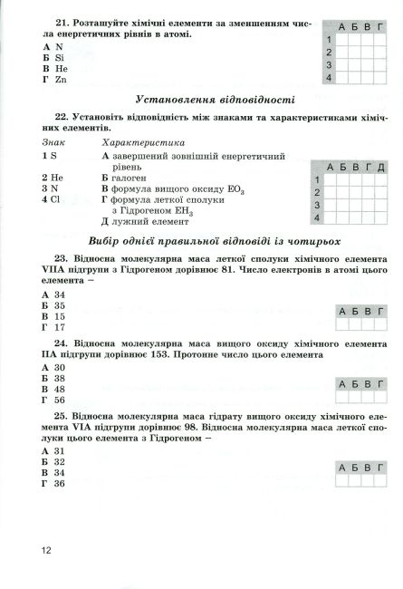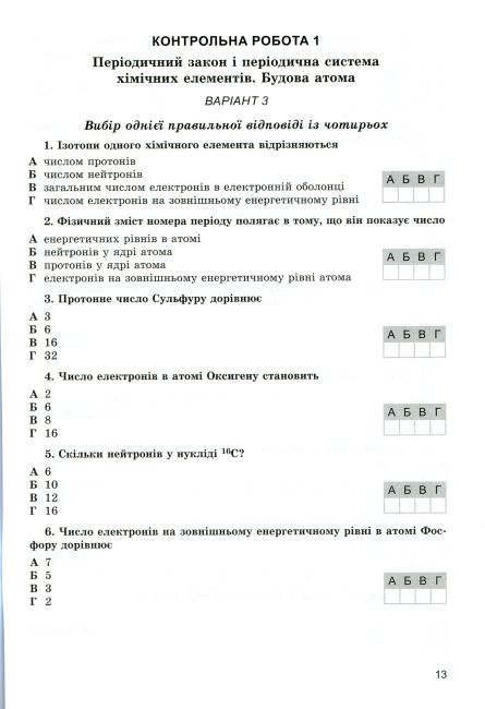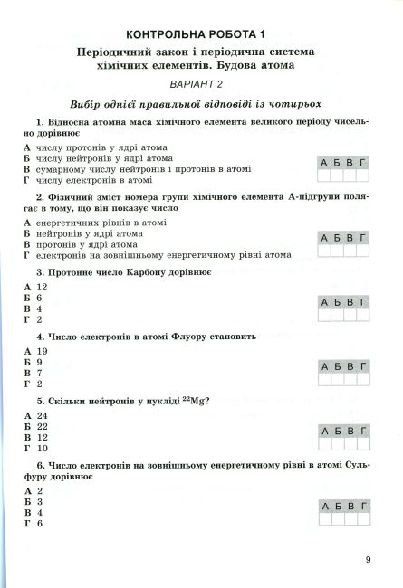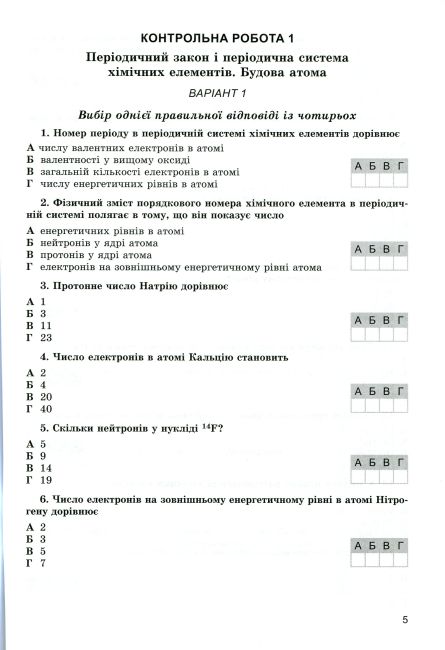 У зошиті подано п’ять тематичних контрольних робіт, кожна з яких має чотири варіанти. Структура робіт включає тестові завдання різних форм, що дозволяє комплексно оцінити рівень знань і сформованість умінь з хімії.