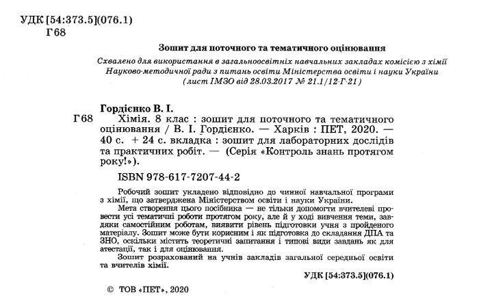 Контроль знань з хімії для 8 класу у вигляді робочого зошита ПЕТ створено відповідно до чинної навчальної програми з хімії для 8 класу, затвердженої Міністерством освіти і науки України.