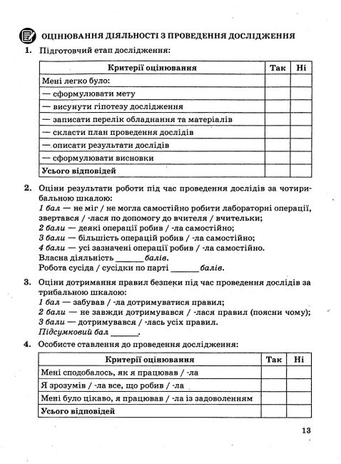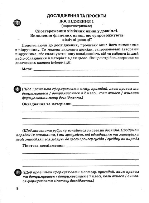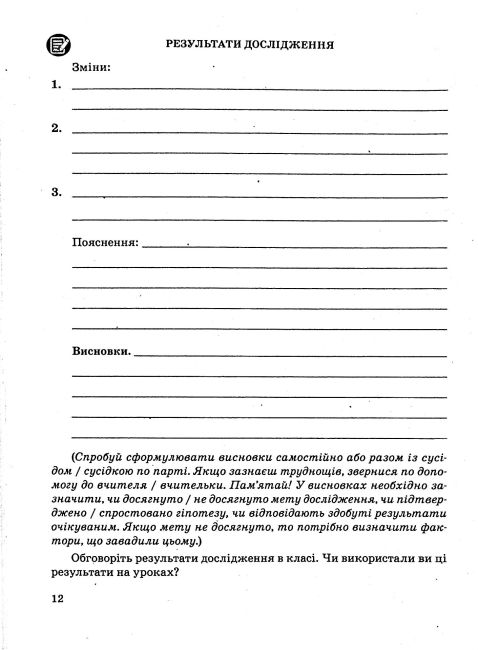 Зошит також містить детальні інструкції щодо виконання робіт, що допомагає учням правильно організовувати експерименти та навчальні проєкти, аналізувати отримані результати і робити висновки.