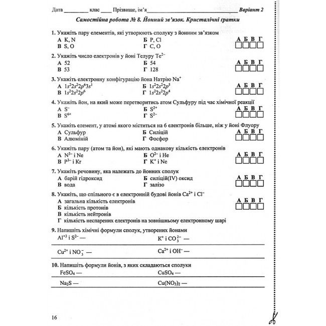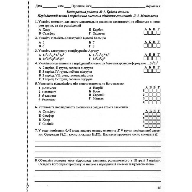 У ньому представлені два варіанти самостійних робіт з усіх розділів шкільного курсу хімії 8 класу. Завдання складені у вигляді тестів різного рівня складності, що дозволяє оцінювати як базові знання, так і більш складні компетентності учнів.