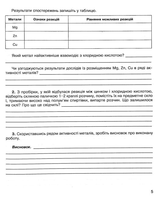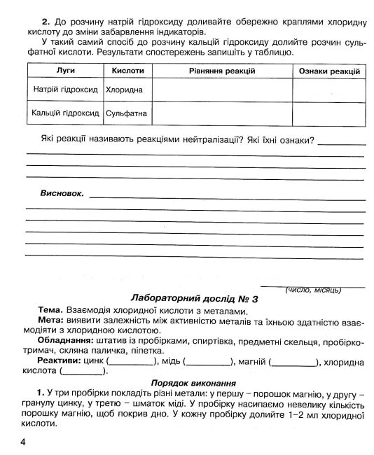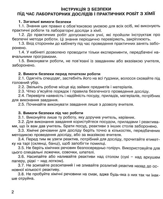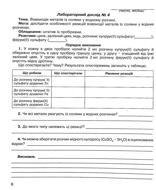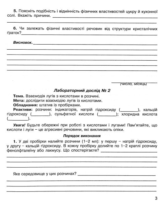 Зошит містить лабораторні досліди та практичні роботи, виконання яких передбачено чинною програмою з хімії для 7–11 класів загальноосвітніх навчальних закладів. Матеріали відповідають програмі, затвердженій у Києві в 2005 році, що забезпечує повний охват тем практичної підготовки учнів.