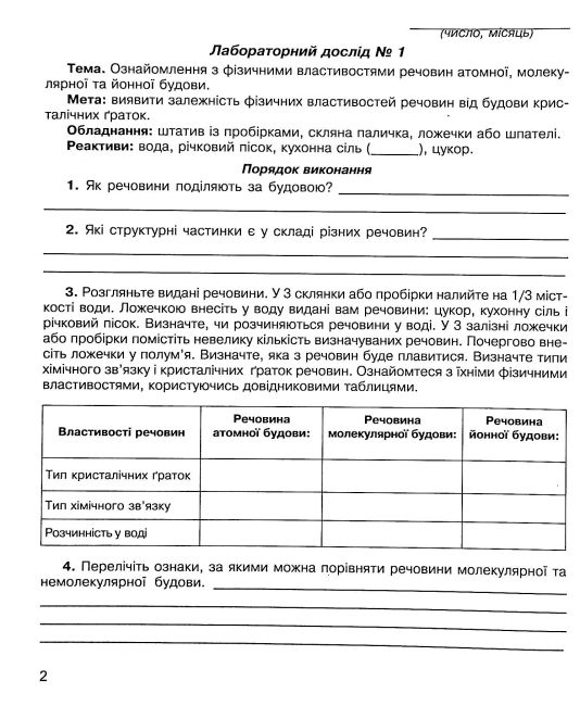 Зошит складається з двох окремих частин — лабораторні досліди та практичні роботи. Така структура дозволяє вчителю гнучко організовувати навчання, відповідно до потреб класу та теми уроку.