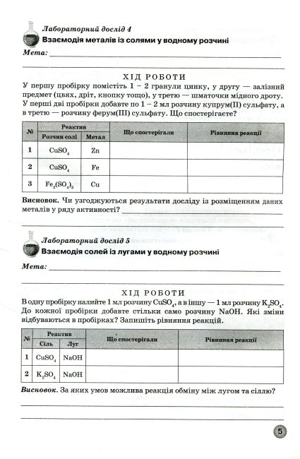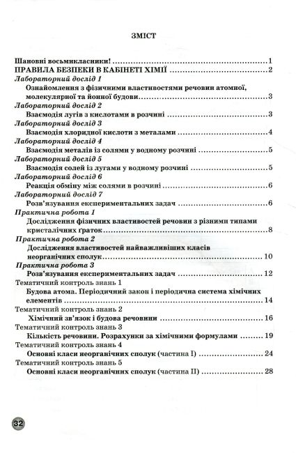 Зошит для практичних робіт, тематичного контролю знань та лабораторних дослідів для учнів 8 класу створено відповідно до чинної програми з хімії для закладів загальної середньої освіти. Видання схвалено для використання в освітньому процесі (лист ІМЗО № 22.1/12-Г-721; протокол № 13 від 8 листопада 2021 року), що підтверджує його якість та офіційний статус.