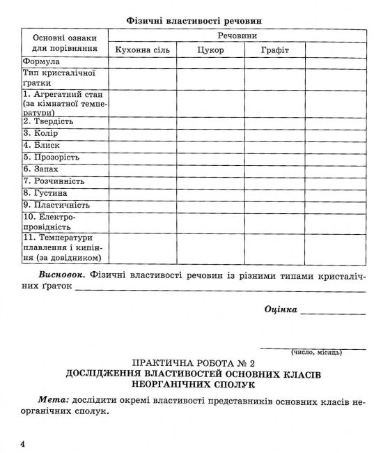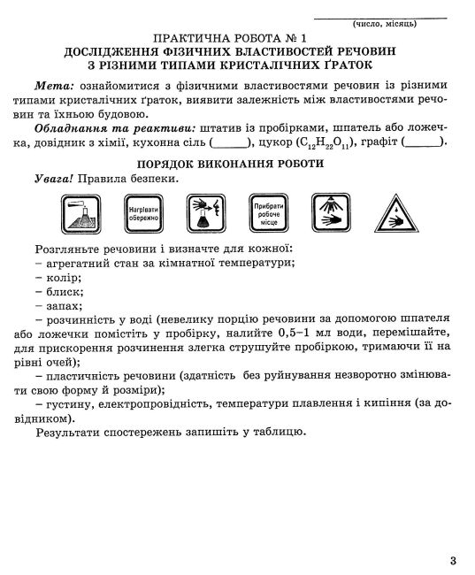 За змістом і структурою посібник повністю відповідає чинній Програмі з хімії для закладів загальної середньої освіти (8 клас). Він передбачає виконання трьох практичних робіт і семи лабораторних дослідів, що дозволяє учням не лише засвоїти теоретичний матеріал, а й закріпити знання через практичну діяльність.