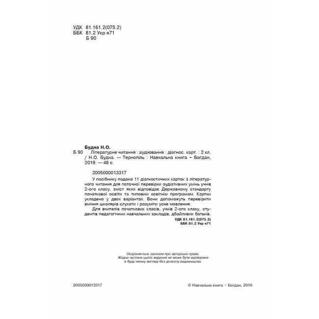 Літературне читання 2 клас Аудіювання Діагностичні картки НУШ Авт: Будна Н. Вид: Богдан