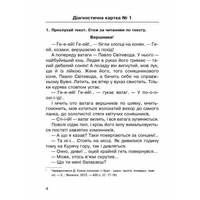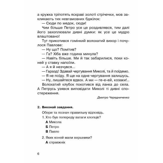 Літературне читання 2 клас Робота з літературним твором Діагностичні картки НУШ. У посібнику подано 12 діагностичних карток з літературного читання для поточної перевірки досвіду читацької діяльності учнів 2-го класу зокрема, робота з літературним твором, зміст яких відповідає Державному стандарту початкової освіти та типовим освітнім програмам. Спеціально дібрані художні тексти та завдання до них допоможуть учителеві перевірити вміння учнів визначати тему тексту, його головну думку, розрізняти жанри, встановлювати послідовність подій у творі, характеризувати вчинки дійових осіб, пояснювати зображувальні можливості художнього слова тощо.