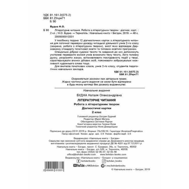 Діагностичні картки Літературне читання Робота з літературним твором 2 клас НУШ Авт: Будна Н.О. Вид-во: Богдан 21216