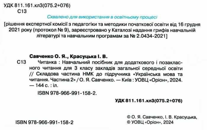 Посібник для додаткового та позакласного читання Читанка 3 клас НУШ Авт: І. Красуцька О. Савченко Вид-во: Оріон 100361