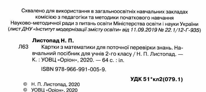 Картки з математики для поточної перевірки знань 2 клас НУШ Н. Листопад Оріон