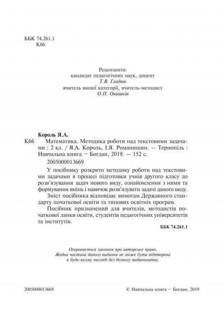 Методика роботи над текстовими задачами Математика 2 клас НУШ Авт: Король Я.А. Романишин І.Я. Вид-во: Богдан 97411